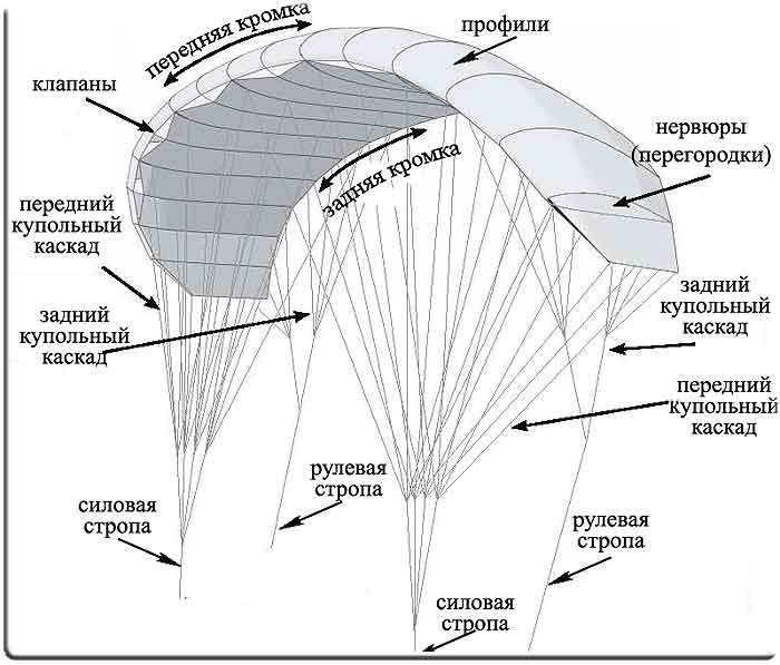Сам купол, состоящий из двух слоев - верхнего и нижнего. Верхняя и нижняя поверхности соединены внутри между собой чередующимися тканевыми перегородками или нервюрами, которые делят крыло на отдельные отсеки. Нервюры формируют поперечный профиль крыла и передают на систему купольных строп тянущее усилие.