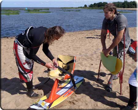 Знакомый подарил Славе кайтборд, на основе которого с помощью другого хорошего знакомого был разработан прототип кайт – кресла. Купив недорого б/у надувной кайт, Слава был готов к практической реализации своей мечты. На этом этапе и произошло наше знакомство. На одном из наших сайтов, где происходит общение кайтеров (кайт гуру) Слава советовался по вопросам настройки приобретенного им кайта, в ходе общения выяснились все подробности этого необычного случая и Андрей Антонов предложил свою помощь в обучении кайтсерфингу.