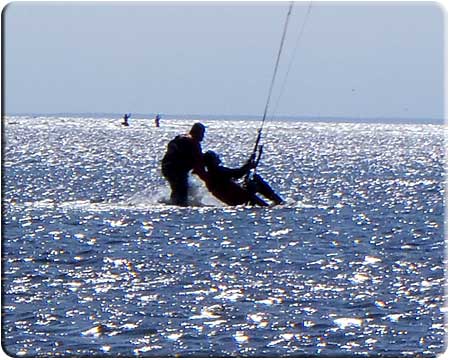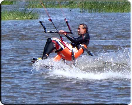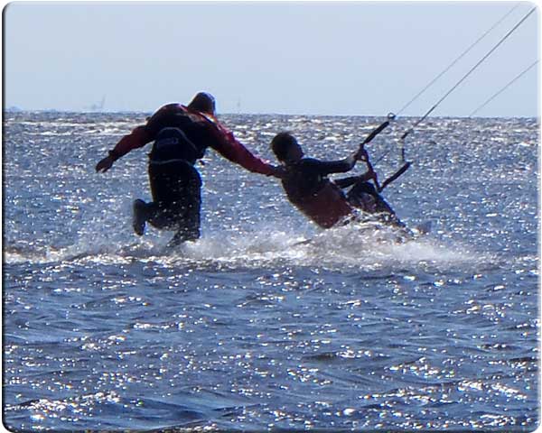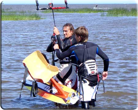 Следующим этапом было обучение Славы навыкам пилотирования надувным кайтом без использования кайтборда, сидя в воде. Слава с этой задачей успешно справился, быстро освоив управление кайтом надувастиком, научился выводить его в зенит, где тяга кайта минимальна, опускать в край ветрового окна и.т.д. Разумеется, эти занятия происходили не за один день, а в несколько приемов.