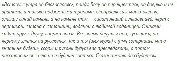 Да отпустит мужа моего, раба Божьего (имя) баба поганая, да уйдет навсегда, чтоб и следа в памяти его не оставила. Пусть скорее воротится ко мне раб Божий (имя), на сторону свою правую, к жене своей законной. Пусть одумается муж неверный, пусть пожалеет меня, пусть по-доброму в семью свою воротится. Да утопит в себе вода святая тоску мою, печаль, да злобу мою, да вернет взамен суженного моего, мужа моего (имя). Да поможет мне Троица Святая в деле моем правом. Да будет так. Аминь. Аминь. Аминь».
