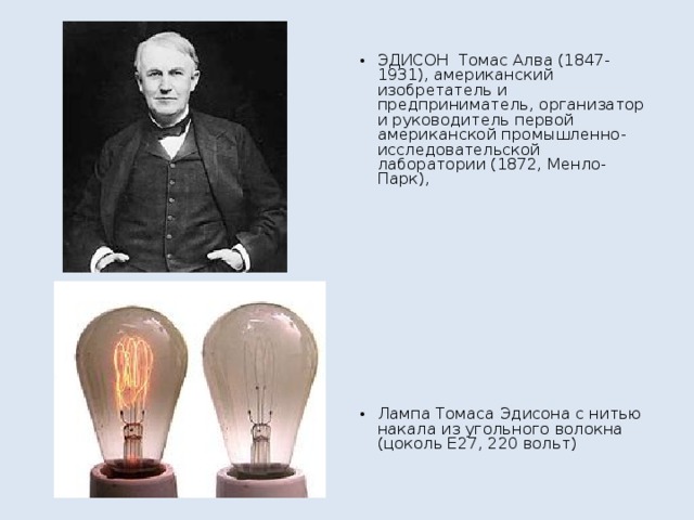 Томас Эдисон – двигатель прогресса19 век – поистине век научных открытий, породивший много великих изобретателей. Одним из них был американец Томас Эдисон, известный, в первую очередь, созданием современной лампочки накаливания.