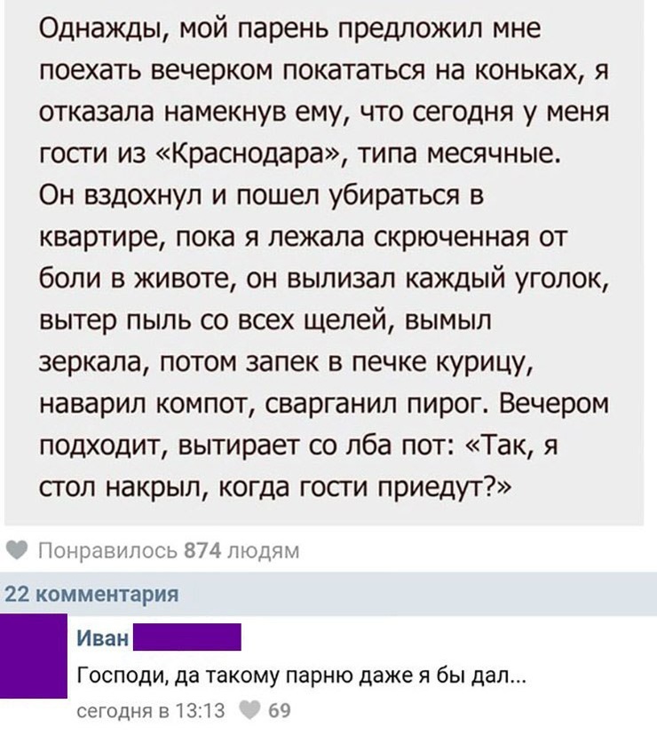Встречаемся с парнем пол года. У него были временные проблемы с финансами, но теперь всё позади. Так вот, он оо мне знает всё (что я люблю, что мне нравиться) в том числе что бы мне было приятно от него получать.