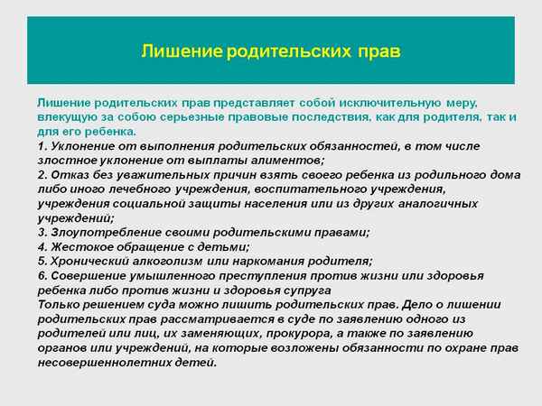 Важно помнить, что лишение родительских прав также прекращает выполнение всех обязательств по алиментам.