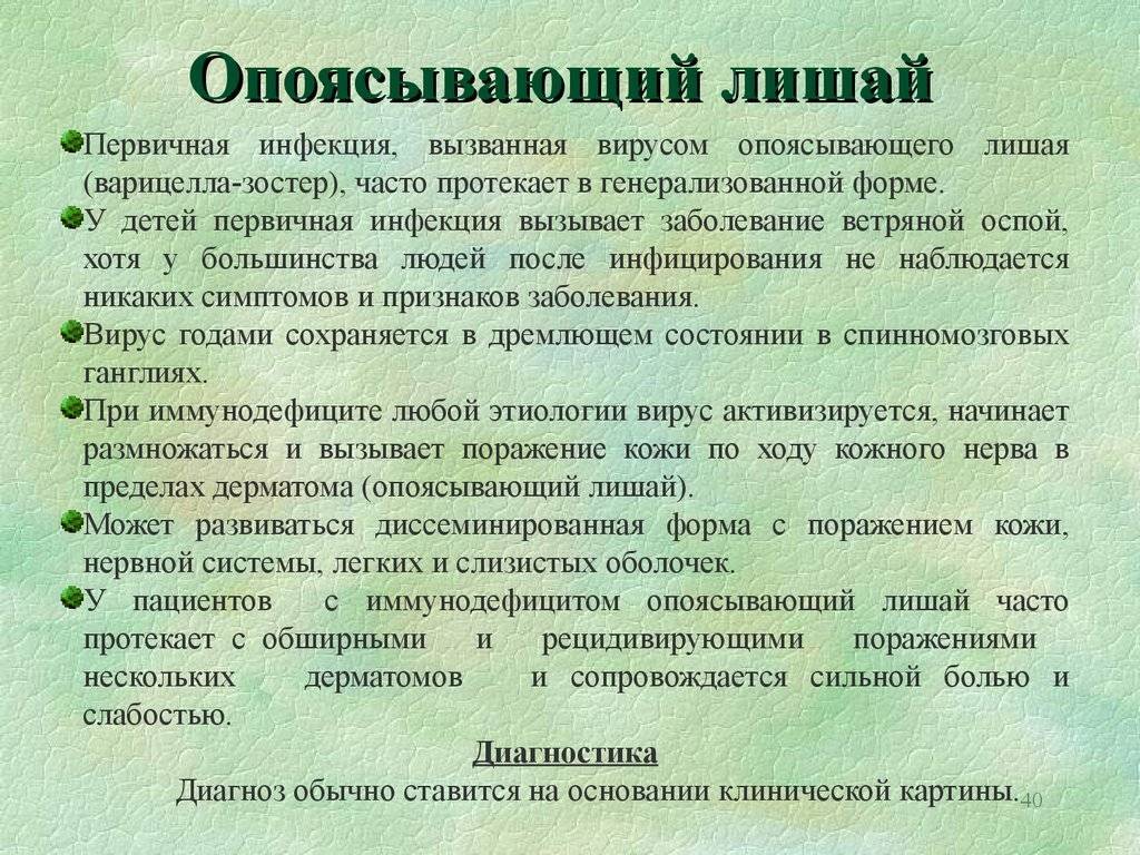 Является заразным, вызывается возбудителем ветряной оспы (вирусом семейства Herpesviridae – Varicella zoster). Чаще развивается у людей старшего или среднего возраста, дети при контакте с такими больными заболевают ветрянкой.