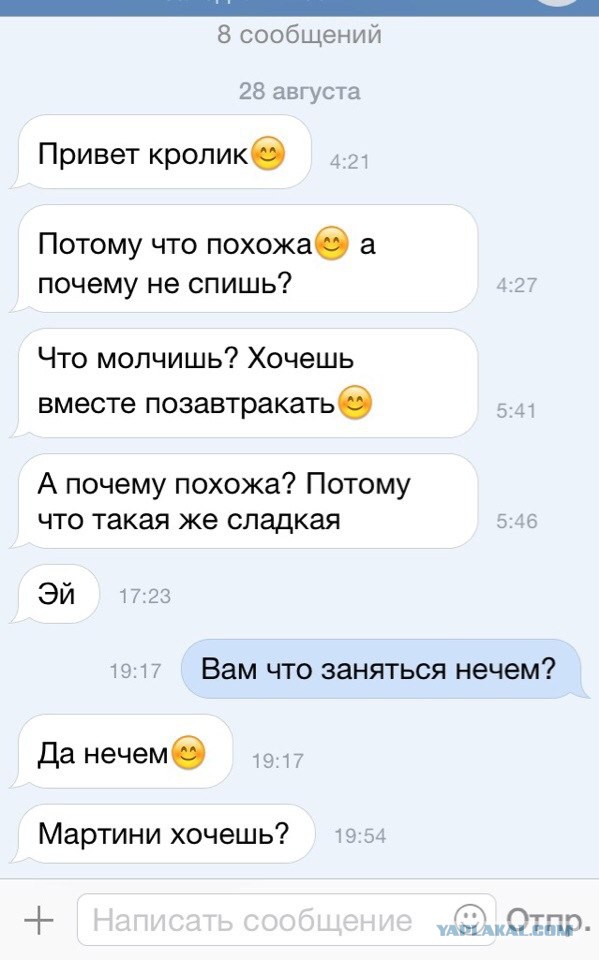 Достижения дебютанткиВоодушевившись рассказами Кристины и разомлев на солнце, я решила удивить своего адресата нежной загадочностью и отправила: «Котенок мой! Целую твой пушистый хвостик!» Новоявленный «котенок» отреагировал мгновенно: «Омерзительно».