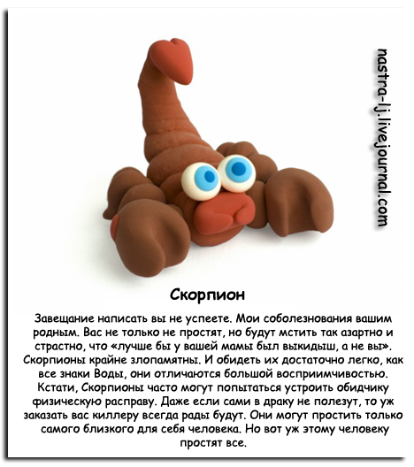 В отличие от других знаков зодиака, Скорпион знает тайну смерти . Секрет — в ядовитой подсказке сказки. Настоящий Скорпион может не спать много ночей, чтобы придумать, как отомстить. Но, честно говоря, стремление к мести — это уж точно не типичная черта Скорпиона. Это просто о том, как бороться с ядом. Мстительность — просто не отличительная черта такого гордого, но отзывчивого знака зодиака.