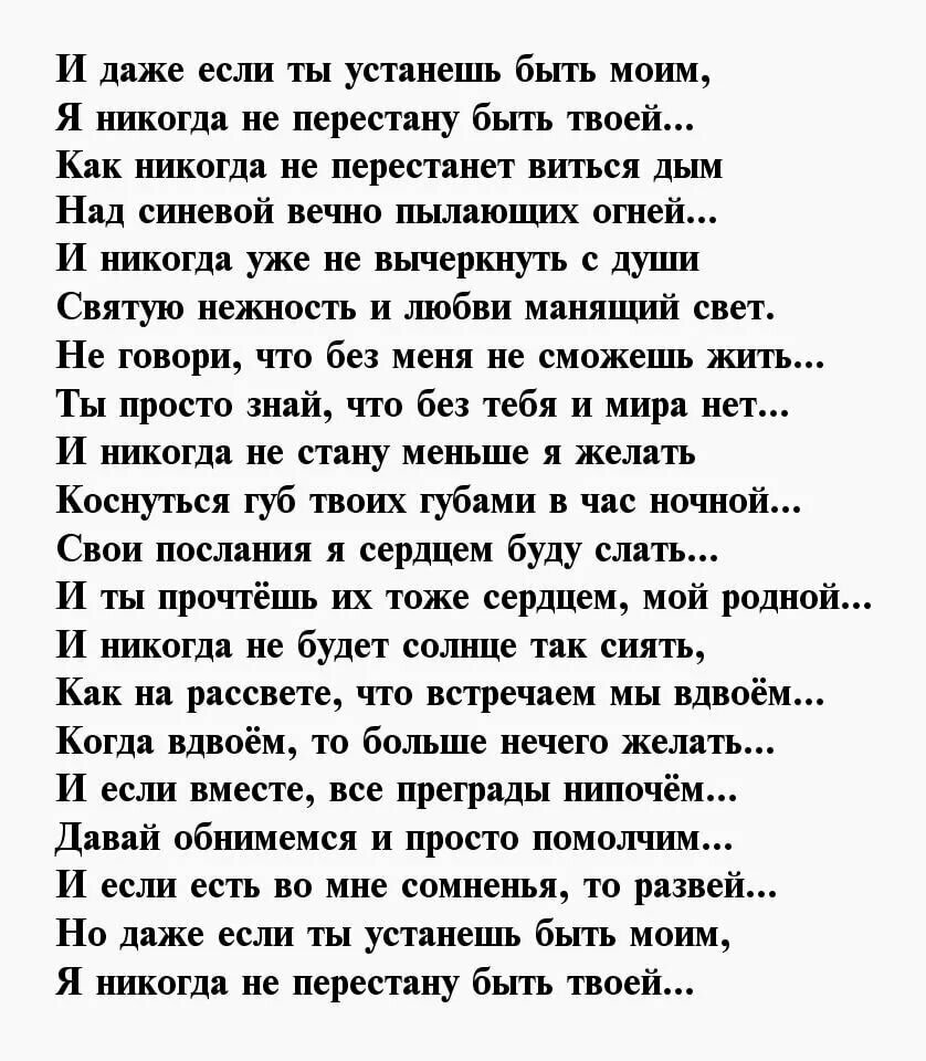 Когда ты рядом, в моем сердце разгорается огонь радости, а в твое отсутствие душою овладевает печаль. Подари же мне счастье видеть твои глаза! Ведь я люблю тебя бесконечно и надеюсь на взаимность. Стремлюсь к тебе и знаю, что эти светлые чувства навсегда.