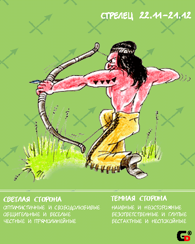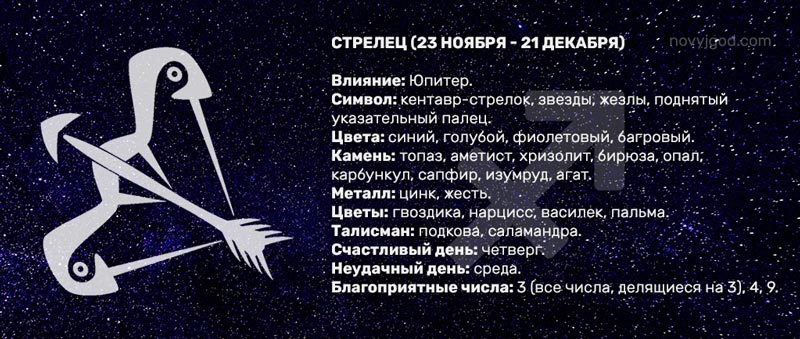 Стрельцы отличаются импульсивным и веселым, но прямолинейным характером. Имея покровительство планеты Юпитер, они просто обречены на успех, в том числе и у представителей противоположного пола. Мужчина-Стрелец – это страстный идеалист, который способен разглядеть звезды сквозь густую пелену облаков. Он не только ставит, казалось бы, недостижимые целы, но и четко знает, как их достичь. Талант стратега Стрелец мастерски применяет и в отношениях с женщинами.