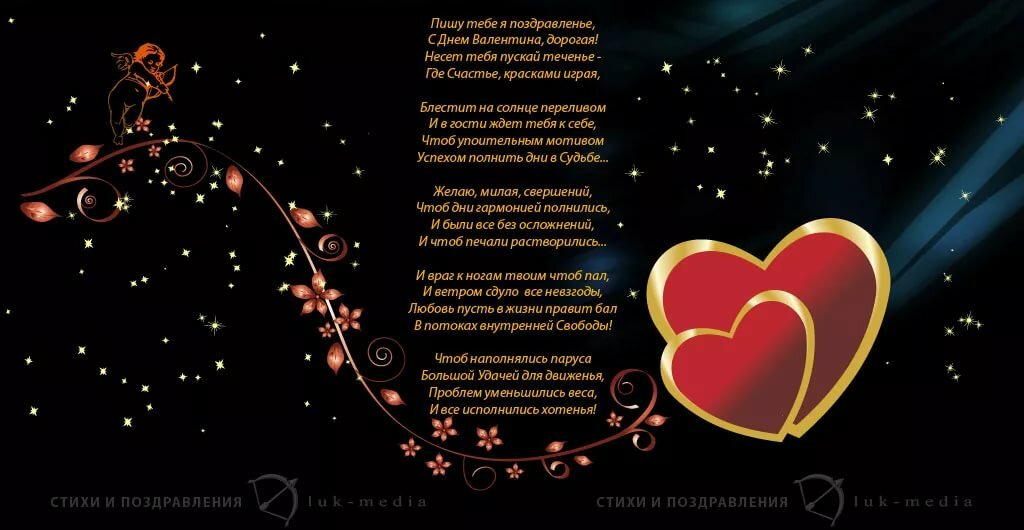• В жизни каждой женщины появляется настоящая любовь, за которую она готова идти даже на край света. В моей жизни встреча с тобой стала самым ярким событием, а ты оказался именно таким любовью. Спасибо и давай продолжать радовать друг друга еще 100 лет! • Реки впадают в море, а мои дороги всегда ведут к тебе. Я без твоего внимания засыхаю, как цветок без воды. Ты мне нужен для жизни, как солнышко нужно всему живому на земле.Я жду ответного признания в этот день, ведь я очень тебя люблю!