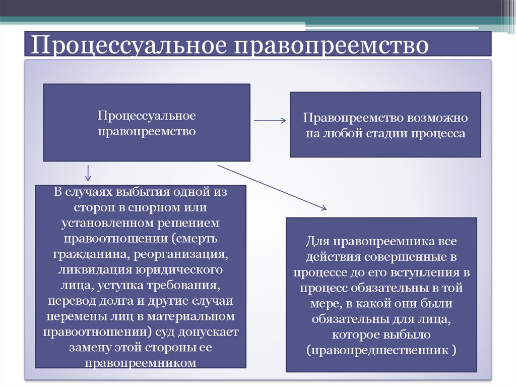 Процессуальное правопреемство – это универсальный способ передачи процессуальных прав и обязанностей от одного или нескольких лиц новому лицу или нескольким лицам после состоявшегося материального правопреемства (смерть гражданина, реорганизация юридического лица, уступка требования, перевод долга и другие случаи перемены лиц в обязательствах). Процессуальное правопреемство возможно на любой стадии процесса.