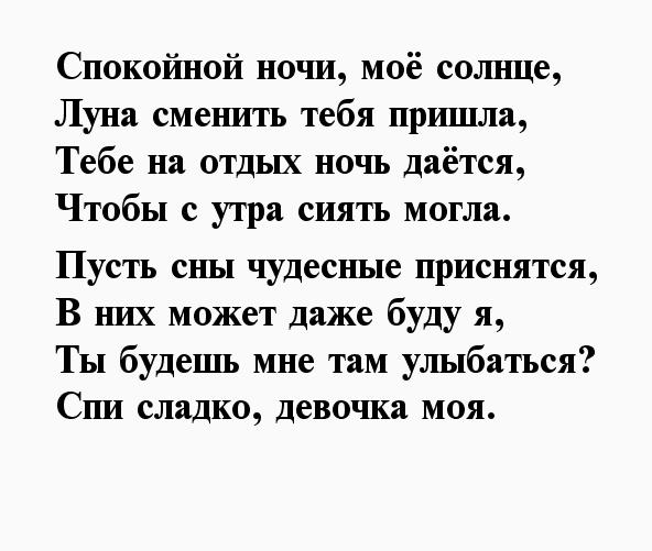 Могла бы болтать с тобой всю ночь, но ночь нещадно заставляет нас ложиться спать! Хорошего сна, мой котик! Спокойной ночи!